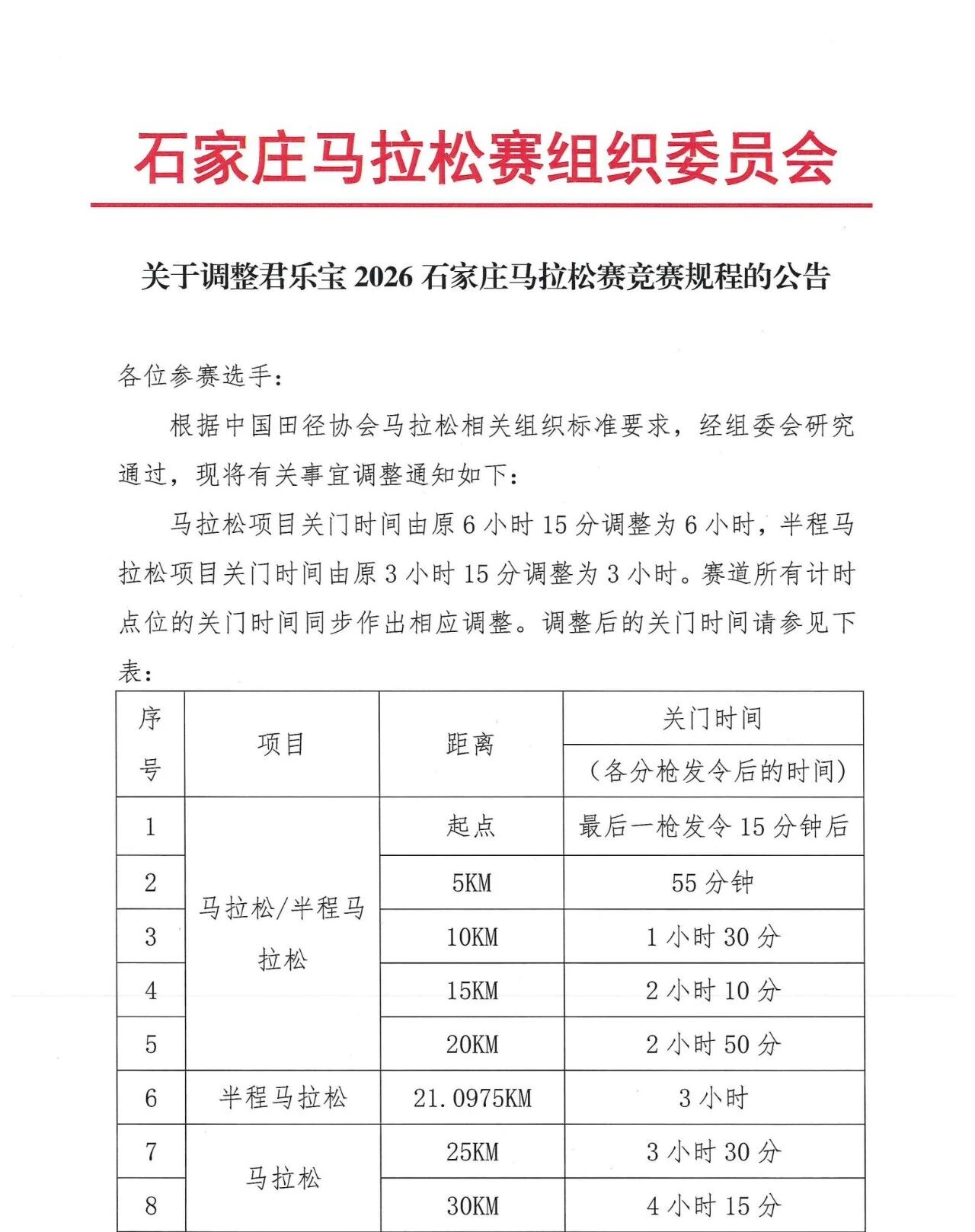 关于调整君乐宝2026石家庄马拉松赛竞赛规程的公告